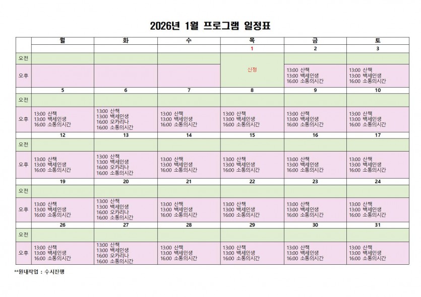 1월 프로그램 일정표 페이지 정보 작성자 지원사업1팀 댓글 0건 조회 35회 작성일 26-01-05 14:00 목록 본문 평화를 빕니다. 1월 프로그램 일정표입니다. 다음글한우리와 함께하는 DoDoDo 25.12.23 댓글 0 댓글목록 등록된 댓글이 없습니다.