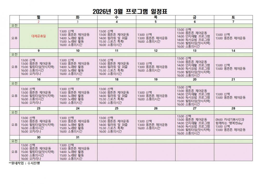 선택없음 3월 프로그램 일정표 페이지 정보 작성자 지원사업1팀 댓글 0건 조회 39회 작성일 26-02-27 17:07 목록 본문 평화를 빕니다. 3월 프로그램 일정표입니다. 이전글2026년 원내작업 사업 설명회 ~ 26.02.27 다음글남구청 건강강좌 치매교육 들었어요 ~ 26.02.27 댓글 0 댓글목록 등록된 댓글이 없습니다.
